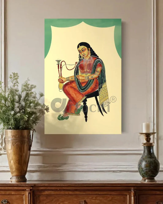 A Courtesan Smoking a Hookah Kalighat Painting Canvas Giclee Print