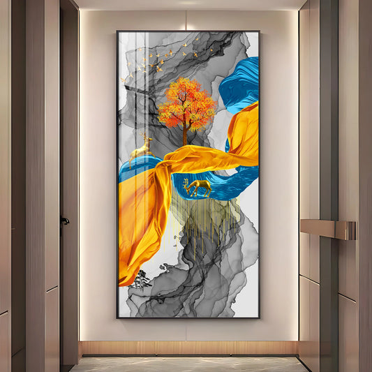 Abstract Golden Ginkgo Leaf With Deer Luxury Crystal Vertical Wall Art