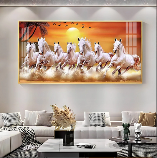 7 White Running Horses in The Sea With Sunrise Premium Acrylic Horizontal Wall Art
