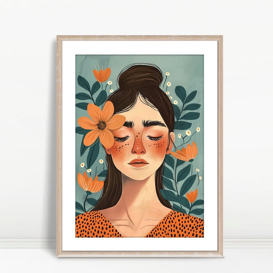 YF Woman with Orange Flowers Blue Background