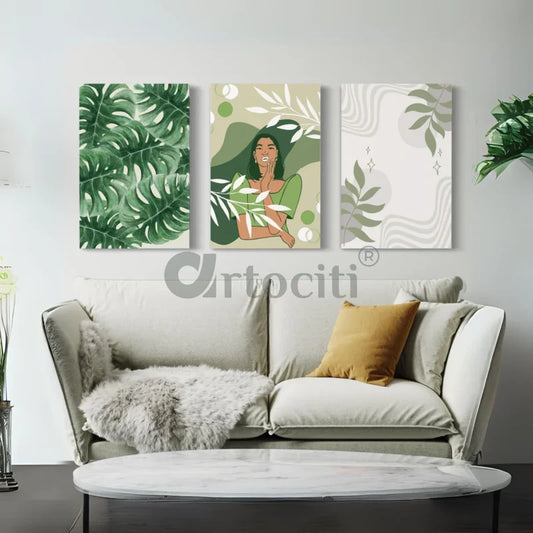 Boho Chic Canvas Painting In Green Featuring a Lady (Set of 3)