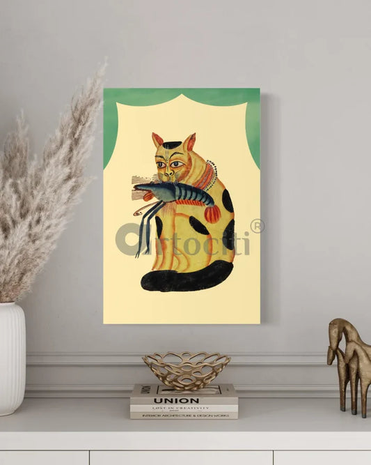Cat with Vaishnavite Mark Stealing Crayfish Kalighat Painting Canvas Giclee Print