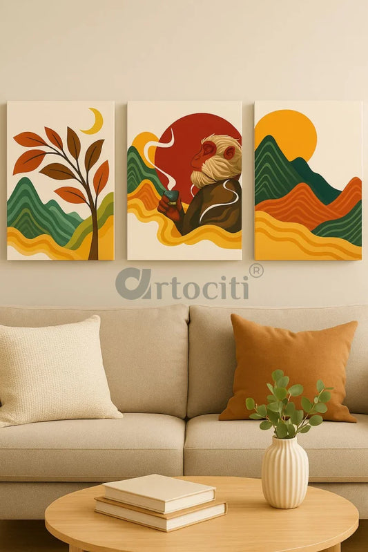 Set of 3 Boho Chic Abstract Monkey & Nature Canvas Wall Painting