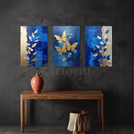 Golden Butterfly and Leaves Abstract Canvas Art Set (Set of 3)