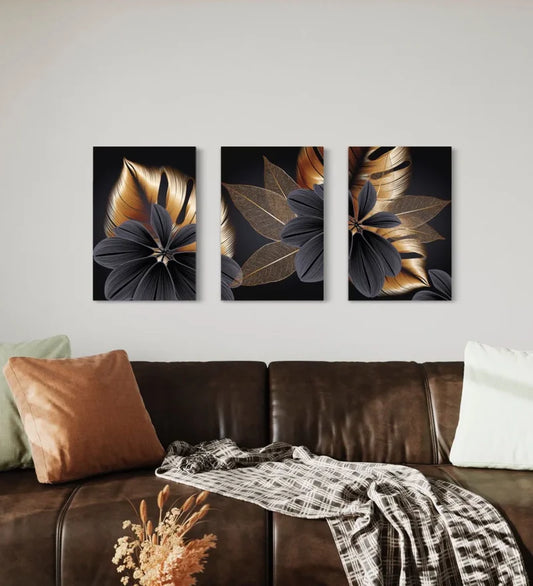 Modern Abstract Canvas Painting Golden Black Leaves Set of 3