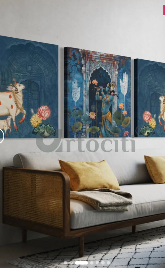 Divine Pichwai Trio: Krishna With Cows Pichwai (Set Of 3) Canvas Set