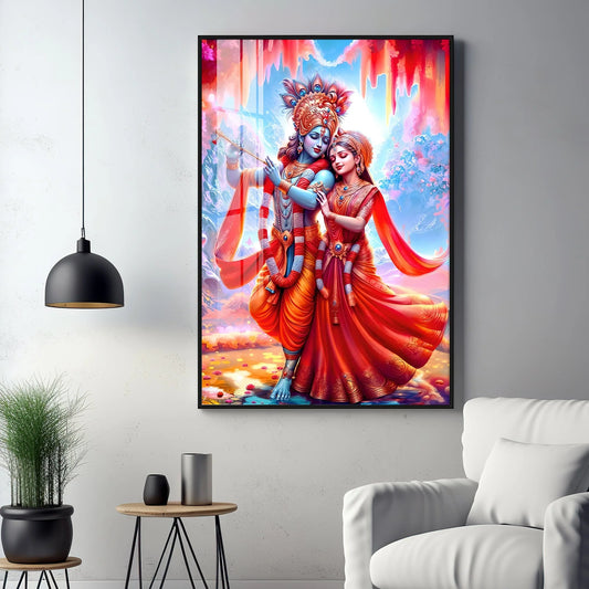 Beautiful Radha Krishna In Red Luxury Crystal Vertical Wall Art