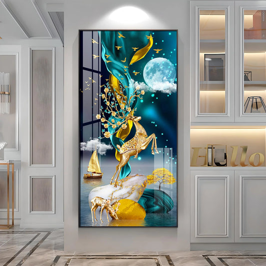 Heavenly Golden Deer Luxury Crystal Vertical Wall Art