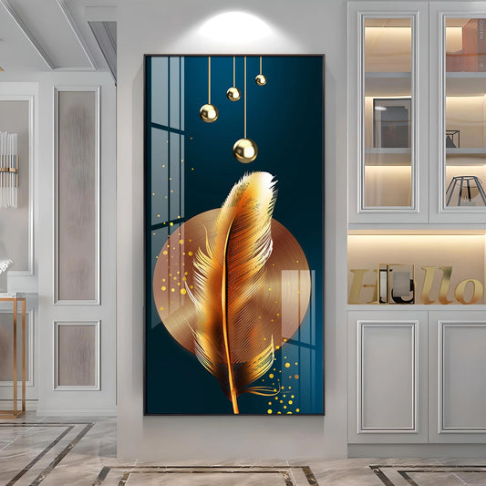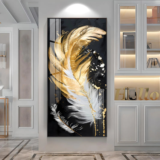 White & Golden Feather Luxury Crystal Vertical Wall Art