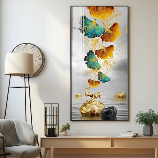 Golden Elk Leaves With Deer Luxury Crystal Vertical Wall Art