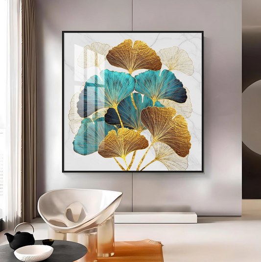 Golden Blue Ginkgo Leaf Premium Acrylic Square Wall Art