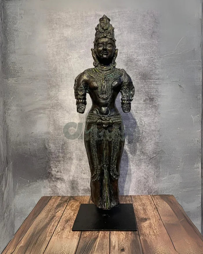 Measuring approximately 24.5 inches high, this sculpture features intricate carvings that reflect temple sculpture aesthetics from India’s classical period. Adorned with elaborate jewelry, sacred threads, and a serene facial expression, it evokes timeless divinity and cultural refinement. The sculpture is mounted on a sturdy flat base, making it ideal for tabletop or pedestal display in your home, office, or spiritual corner.