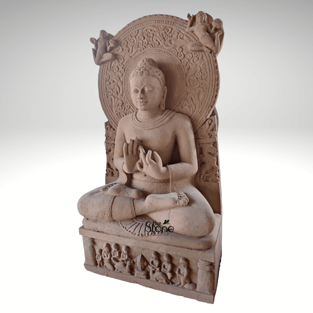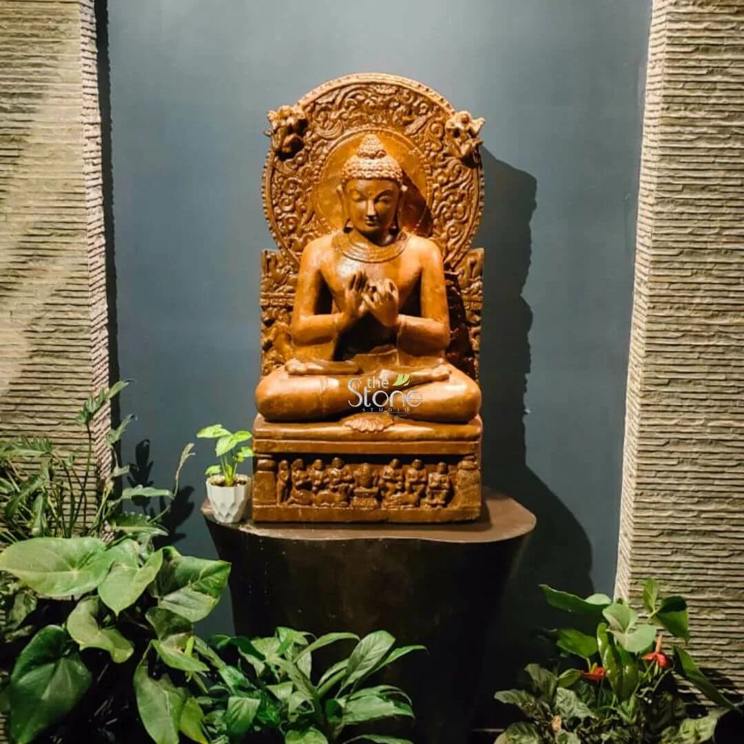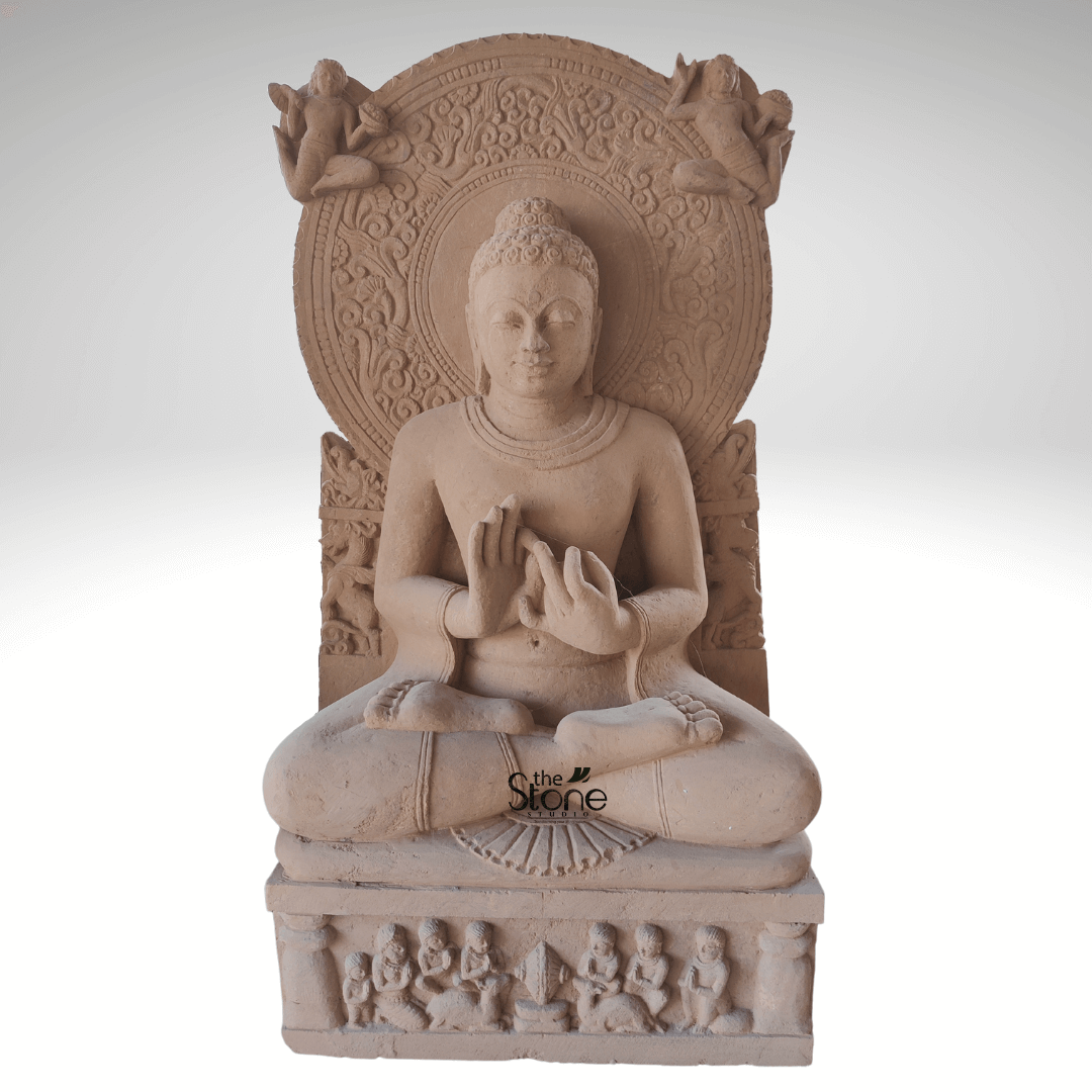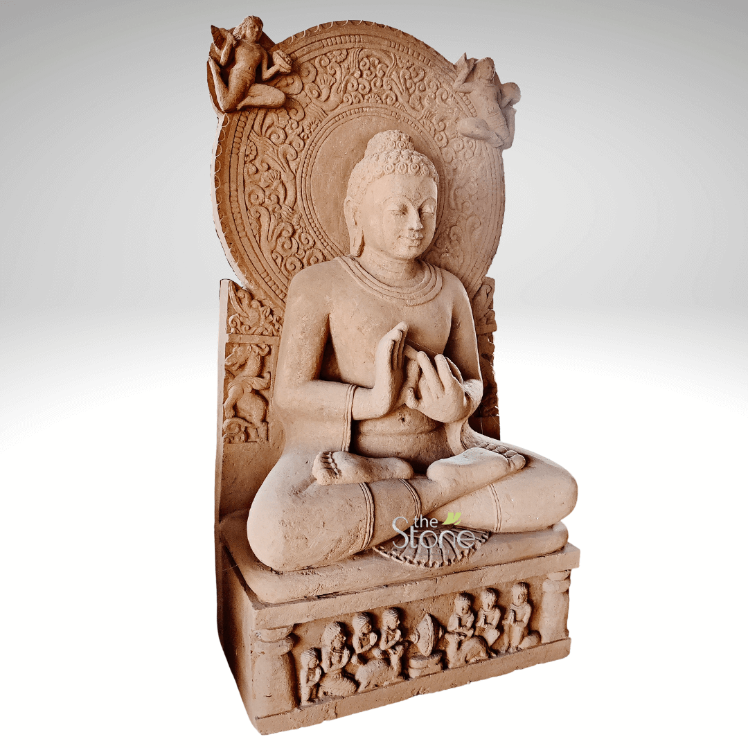 The material used in it is sandstone. This sculpture is wonderfully crafted by our best artisans. For more such statues browse our website. If you still don’t get what you want, our artisans will craft your specified designs of 3 feet Sarnath Buddha statue with utmost care and love.