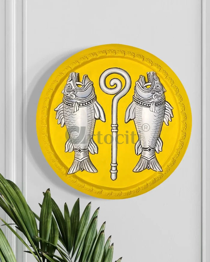 Crafted from durable fiberglass, this mural is finished in a vibrant multicolor palette with a rich yellow backdrop that instantly elevates any space. The two fish, depicted in mirrored symmetry, flank a central spiral motif, evoking spiritual energy and regal symbolism. Every curve and scale is carefully sculpted to reflect the traditional essence of the Pandya era.