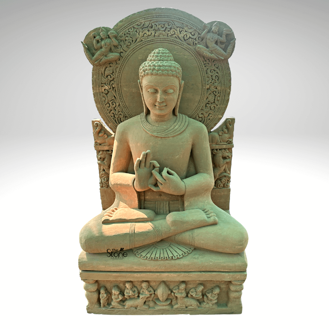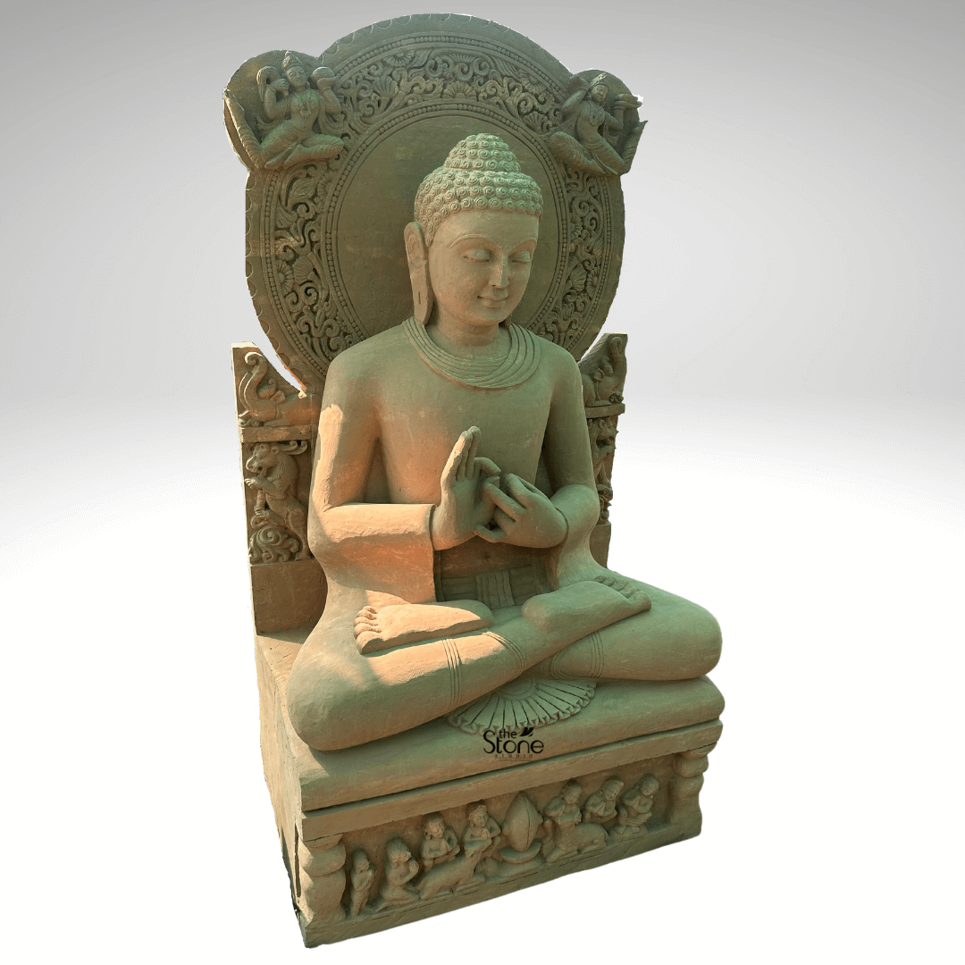The material used in it is sandstone. This sculpture is wonderfully crafted by our best artisans. For more such statues browse our website. If you still don’t get what you want, our artisans will craft your specified designs of the 6ft dharma chakra Buddha statue with utmost care and love.