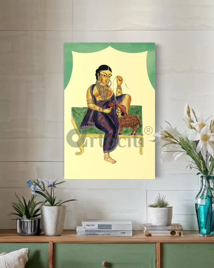 Transform your space with the mesmerizing Kalighat painting "A Courtesan/Actress with Her Admirer." This striking canvas giclee print illustrates a courtesan and her admirer, the latter uniquely depicted as a sheep, adding a layer of satirical charm. The artwork, available in 18X12 Inches and 24X16 Inches, features vibrant colors and intricate details, printed on high-quality 380 GSM canvas for a rich and enduring finish. Perfect for art lovers and those who appreciate historical satire, this print brings both elegance and intrigue to any room.