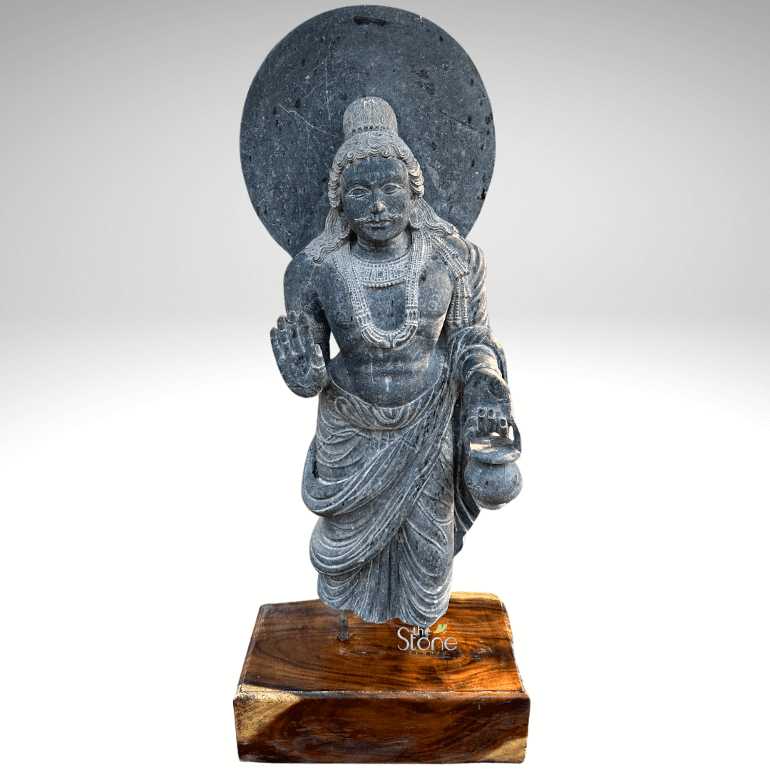 The material used in it is Blackstone. This sculpture is wonderfully crafted by our best artisans. For more such statues browse our website. If you still don’t get what you want, our artisans will craft your specified designs of a Bodhisattva Maitreya statue with utmost care and love.