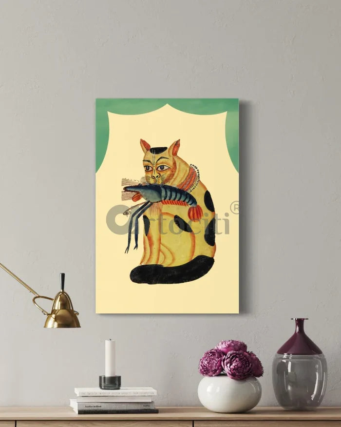 Elevate your space with the "Cat with Vaishnavite Mark Stealing Crayfish" Kalighat painting, a striking representation of Bengali satire or proverbs on religion. This vibrant artwork, available in 18x12 inches and 24x16 inches, adds a touch of cultural humor to your home. Printed on 380 GSM canvas, it ensures longevity and premium quality. Perfect for art enthusiasts and collectors, this piece brings a unique blend of tradition and whimsy to any decor.