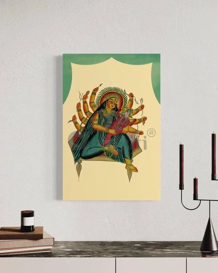 Embrace the divine affection of "Ganesha in the Lap of Parvati" captured in this exquisite Kalighat painting Canvas Giclee Print. Available in two sizes, 18X12 inches and 24X16 inches, this 380 GSM print offers vibrant colors and intricate details that bring the sacred moment to life. Perfect for enhancing your home or office with spiritual grace.