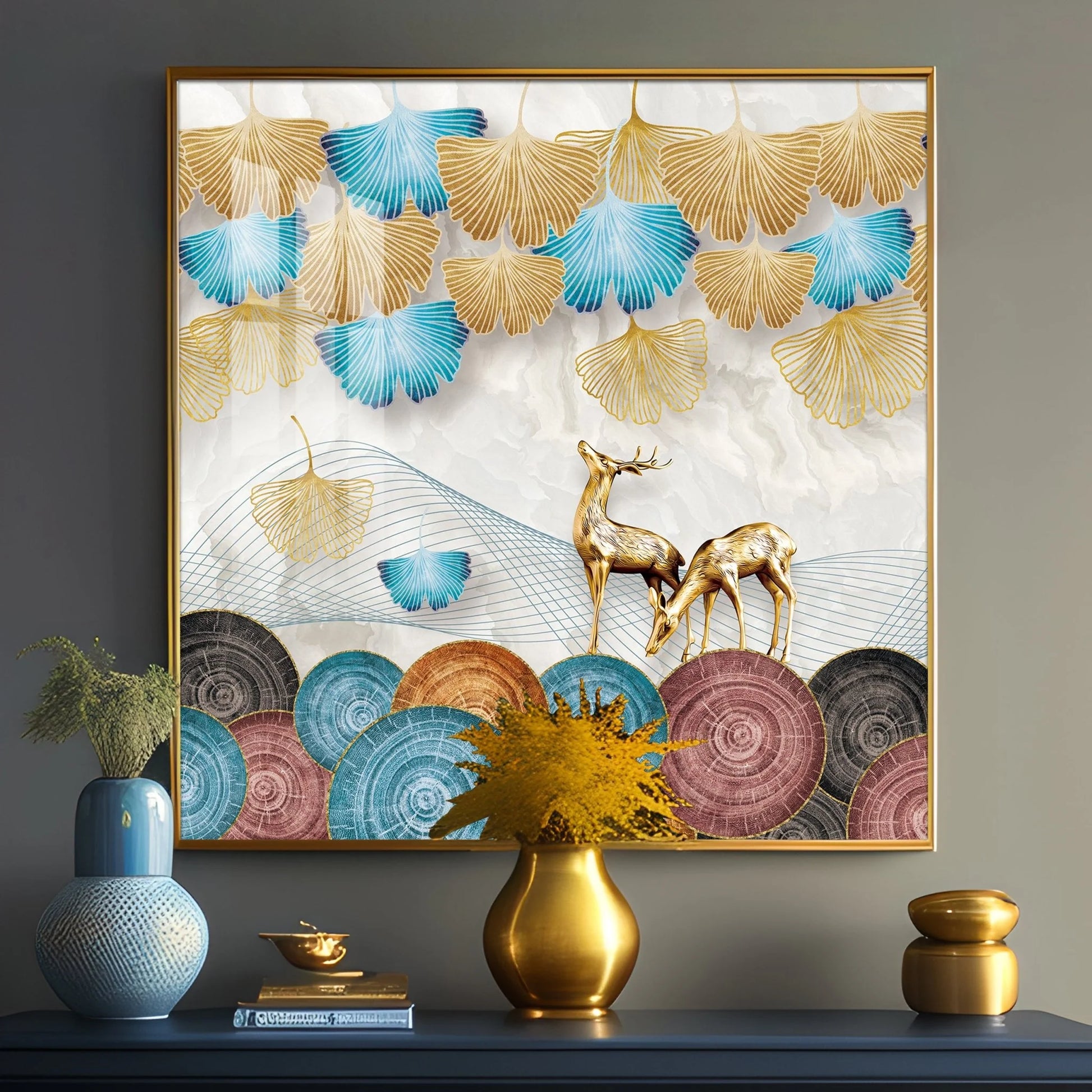 Golden Deer With Ginkgo Leaf Premium Acrylic Square Wall Art