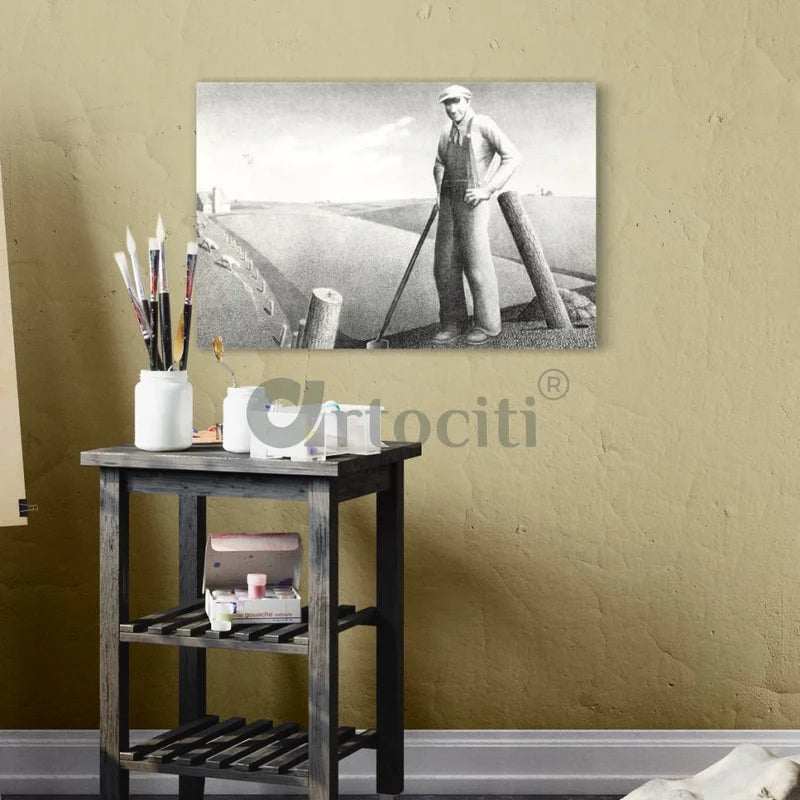 Bring the vibrant essence of spring into your space with this exquisite canvas giclée print of Grant Wood's iconic masterpiece, "In the Spring." Available in sizes of 16x24 inches and 20x30 inches, each print is meticulously crafted on high-quality 380 GSM canvas to ensure vivid colors and fine details. Elevate your décor with the timeless charm and picturesque beauty of this renowned artwork, capturing the essence of rural life in America. Perfect for art enthusiasts and admirers of classic American art alike, this print is a stunning addition to any home or office setting.
