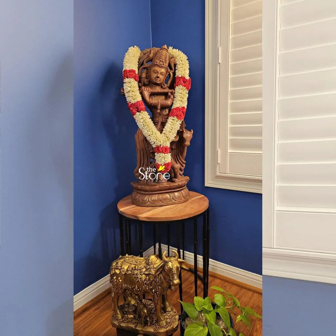 The material used in it is Pink Stone. This sculpture is wonderfully crafted by our best artisans. For more such statues browse our website. If you still don’t get what you want, our artisans will craft your specified designs of the Lord Krishna pink stone statue with utmost care and love.