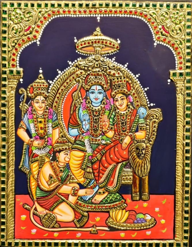 Tanjore paintings are a traditional South Indian art form known for their rich colors, intricate details, and use of gold foil. They usually depict Hindu gods and goddesses, featuring intricate designs that give a vibrant and divine appearance. Kodantarama with frame.
