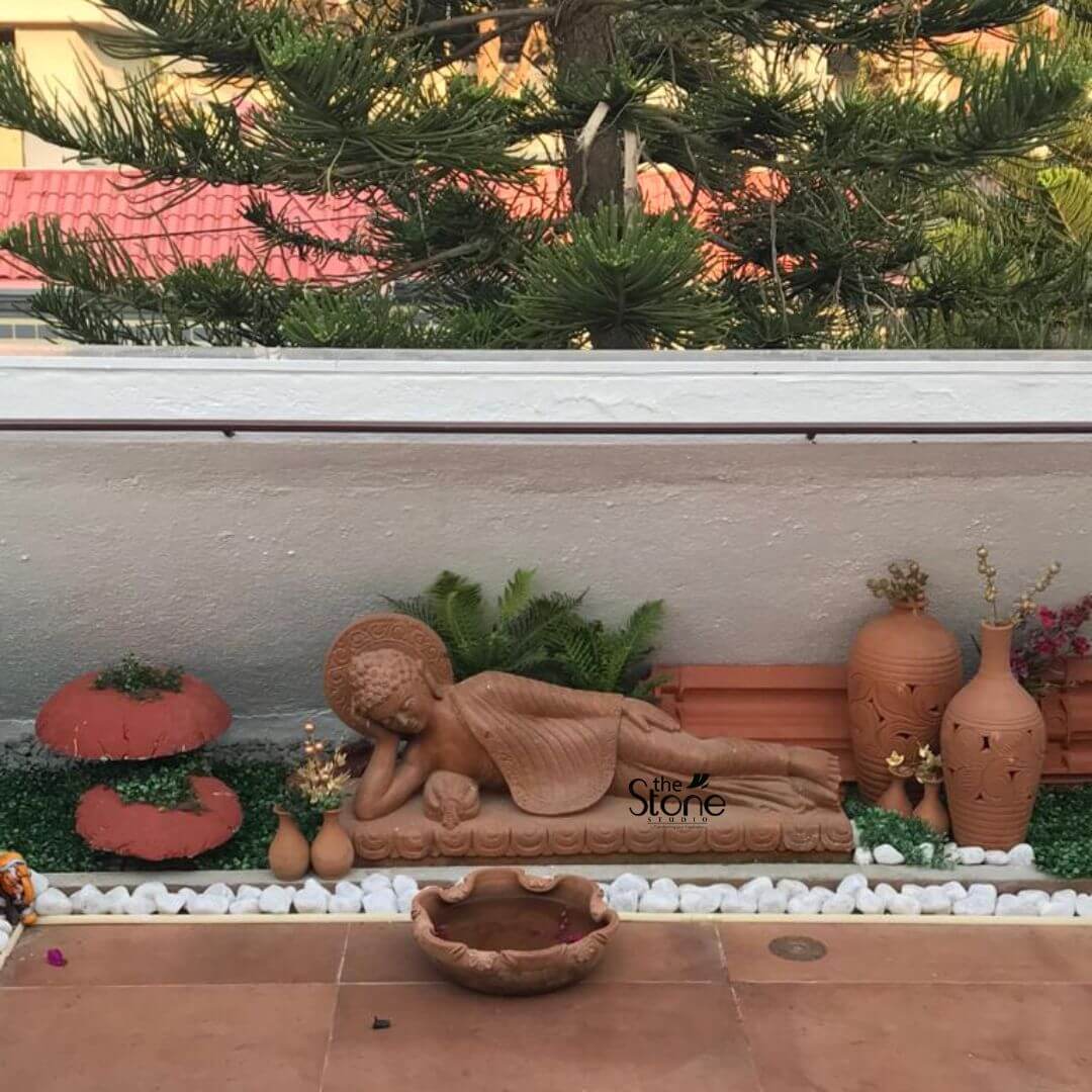 The material used in it is Brown Sand Stone. This sculpture is wonderfully crafted by our best artisans. For more such statues browse our website. If you still don’t get what you want, our artisans will craft your specified designs of the sleeping Buddha statue with utmost care and love.