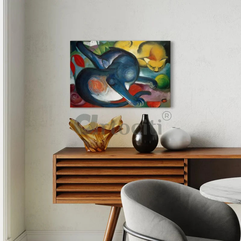 Bring the iconic work of Franz Marc into your space with our canvas giclée print of "Two Cats, Blue and Yellow, 1912." Available in sizes 16x24 inches and 20x30 inches, this high-quality reproduction captures every detail of Marc's masterpiece. Printed on 380 GSM canvas, the colors pop with vividness and clarity, adding a bold statement to any room. Whether you're a fan of Marc's expressive style or simply adore feline art, this print is sure to captivate. Elevate your décor with this timeless piece that celebrates the beauty and charm of these two colorful cats.