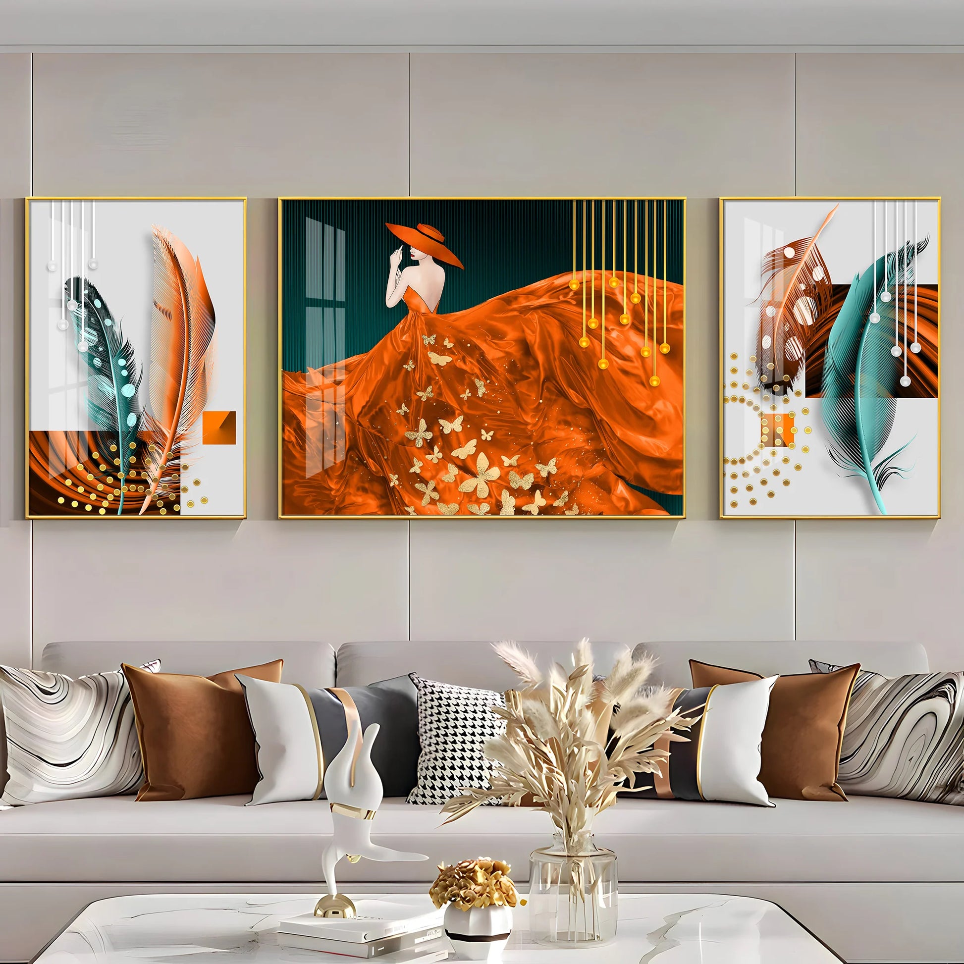 Women In Beautiful Orange Outfit Premium Acrylic Wall Art (Set of 3)